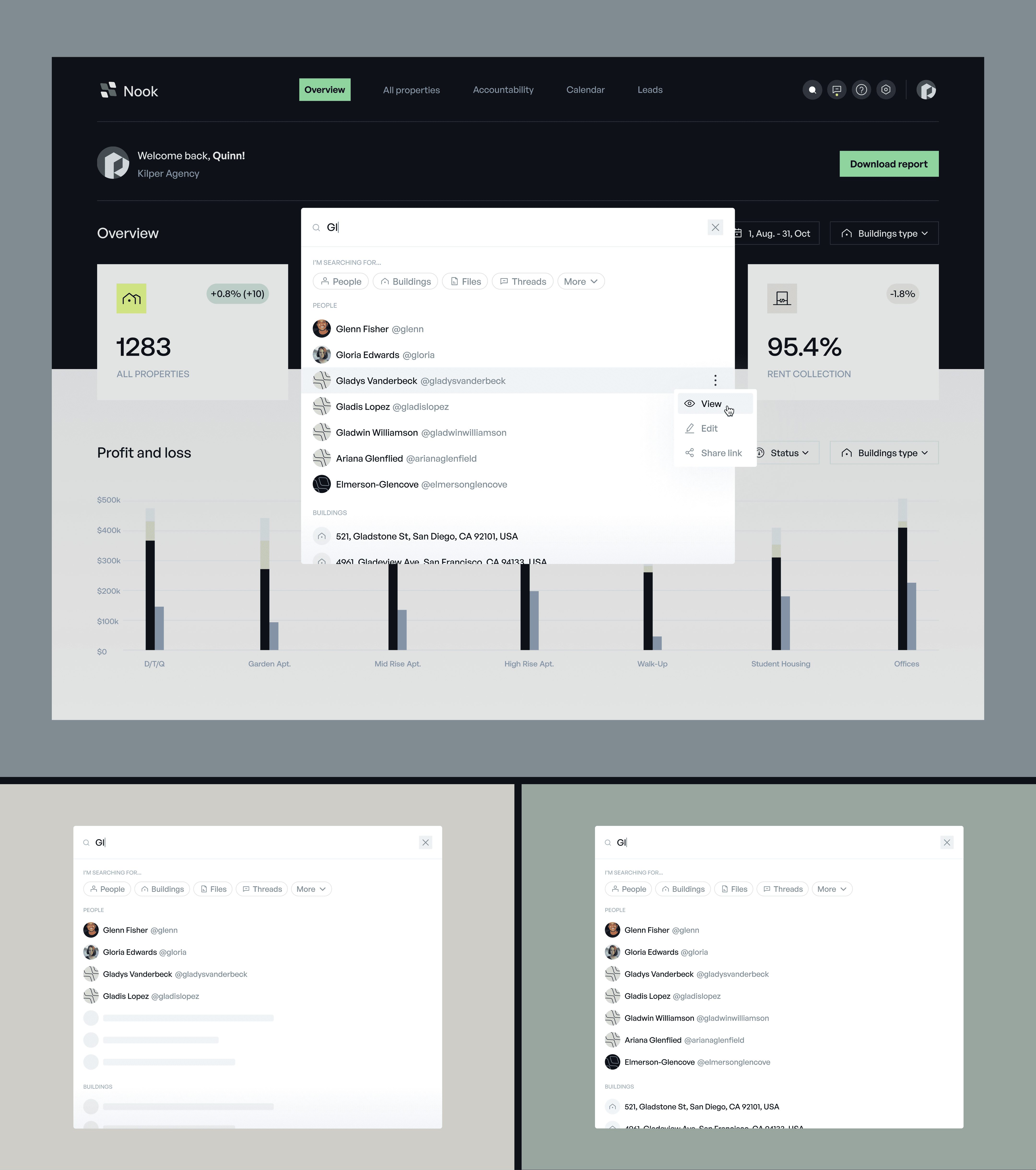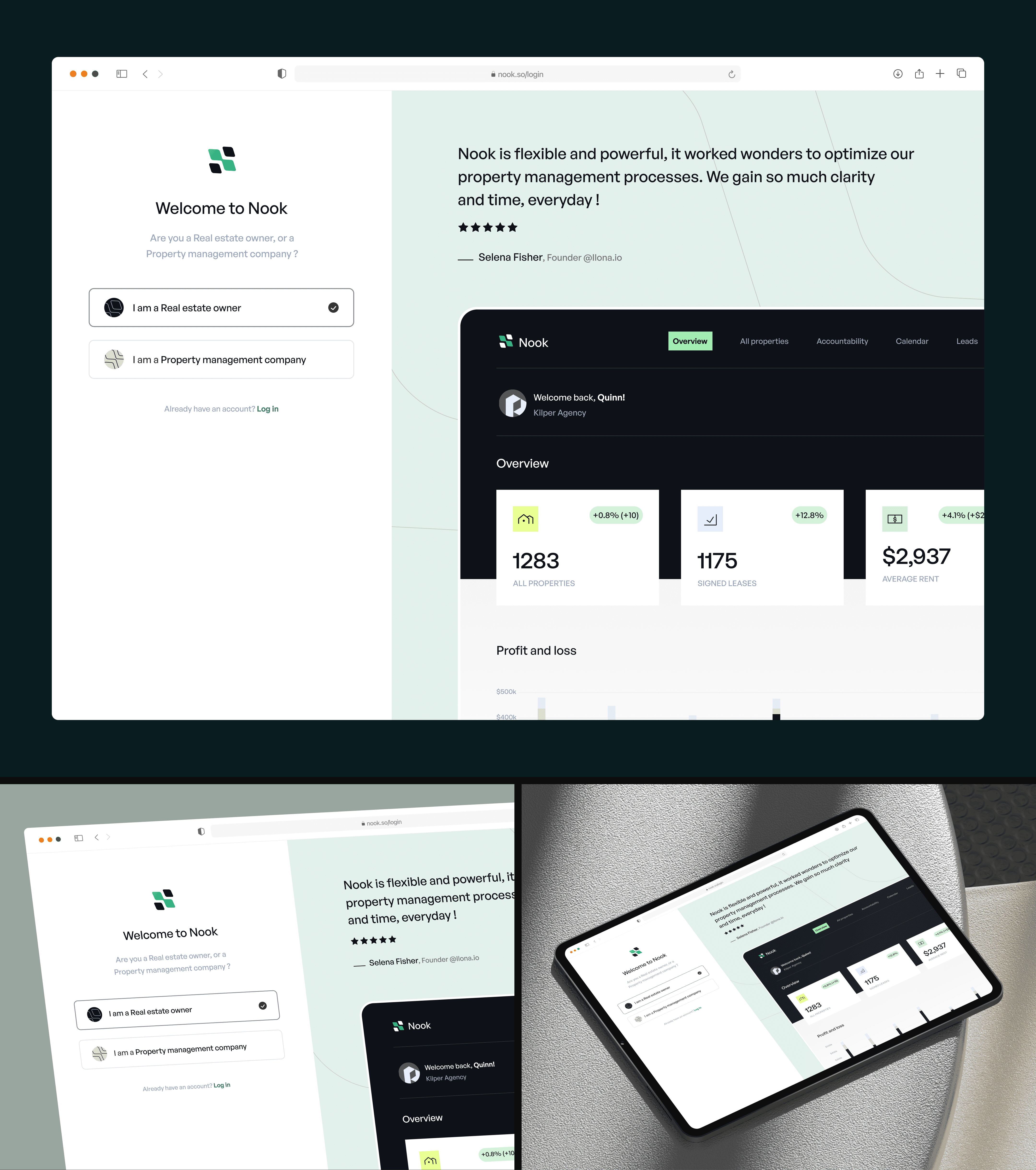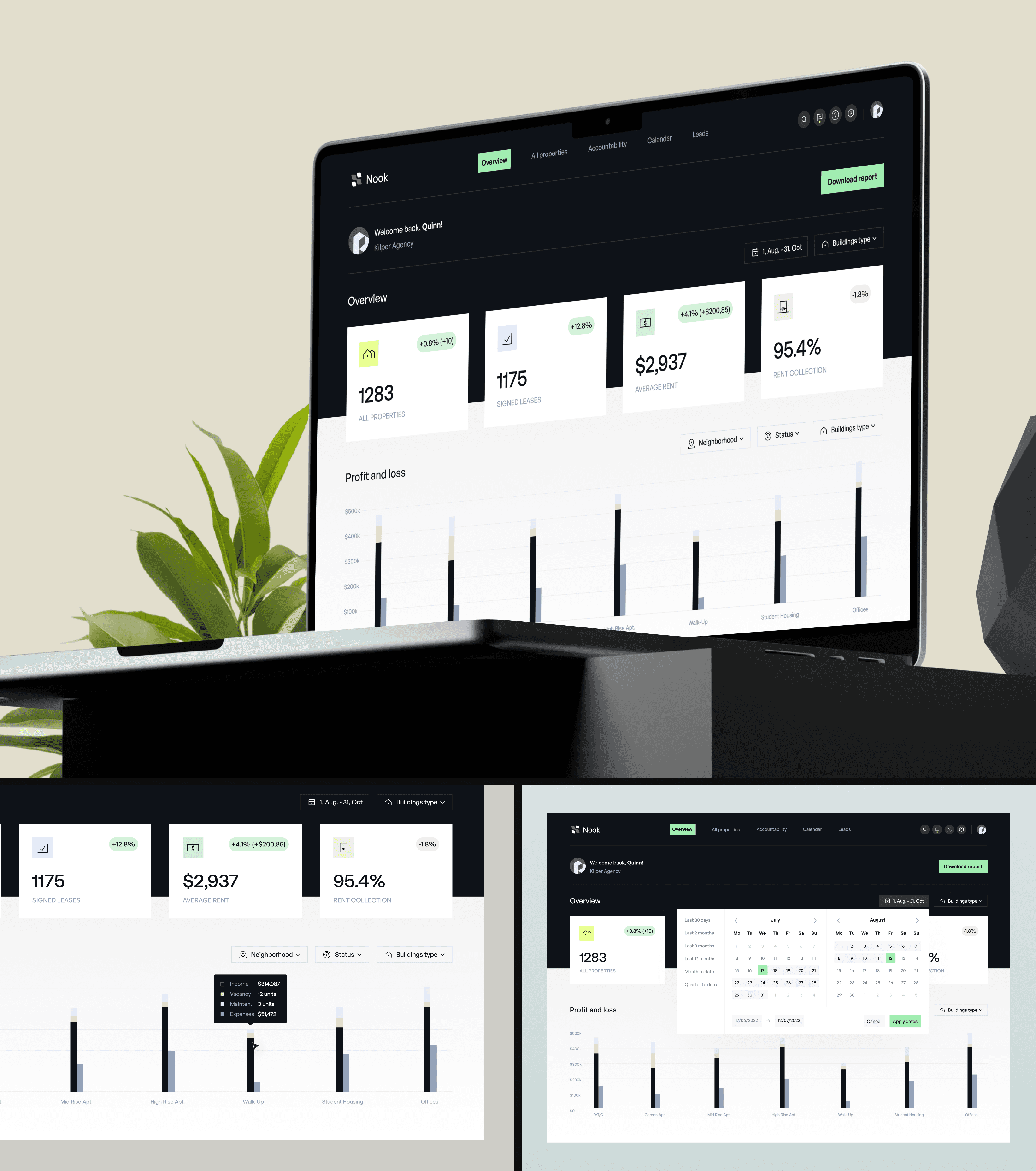 Nook’s mission is to help real estate owners and property management companies operate more efficiently and improve rental performance — while bringing clarity, accountability, and trust to a traditionally complex and fragmented industry. The challenge was to design a product and brand experience that makes property operations easy to understand at a glance, simplifies collaboration across teams, and supports better operational and financial decision-making.