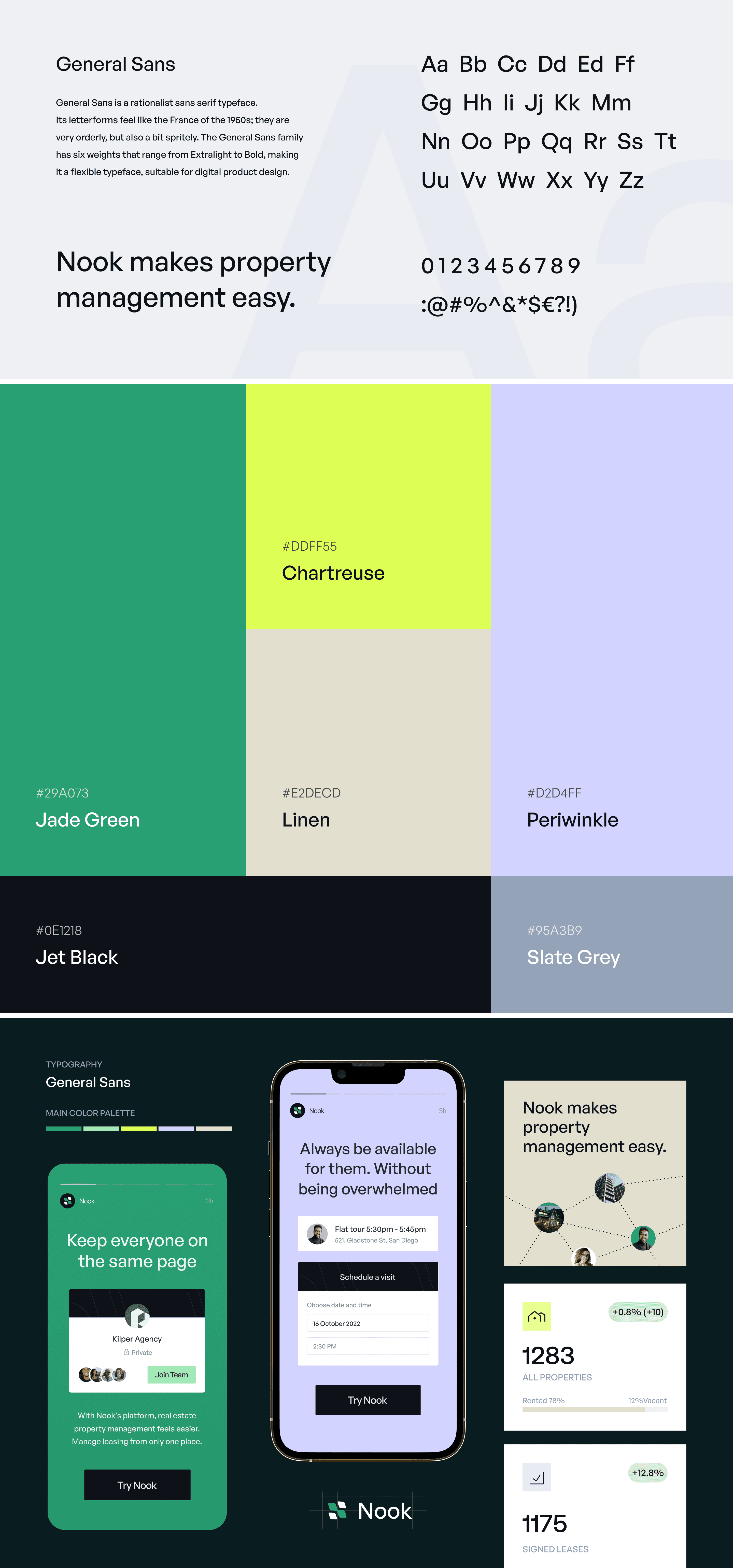 A fresh and trustworthy brand identity We designed Nook’s brand identity to introduce a fresh and modern perspective to property management software—an industry often dominated by dated and overly complex tools. The visual language was intentionally clean, approachable, and professional, with a strong emphasis on clarity and consistency. The goal was to send strong trust signals to real estate companies managing high-value assets and sensitive operational and financial data.
