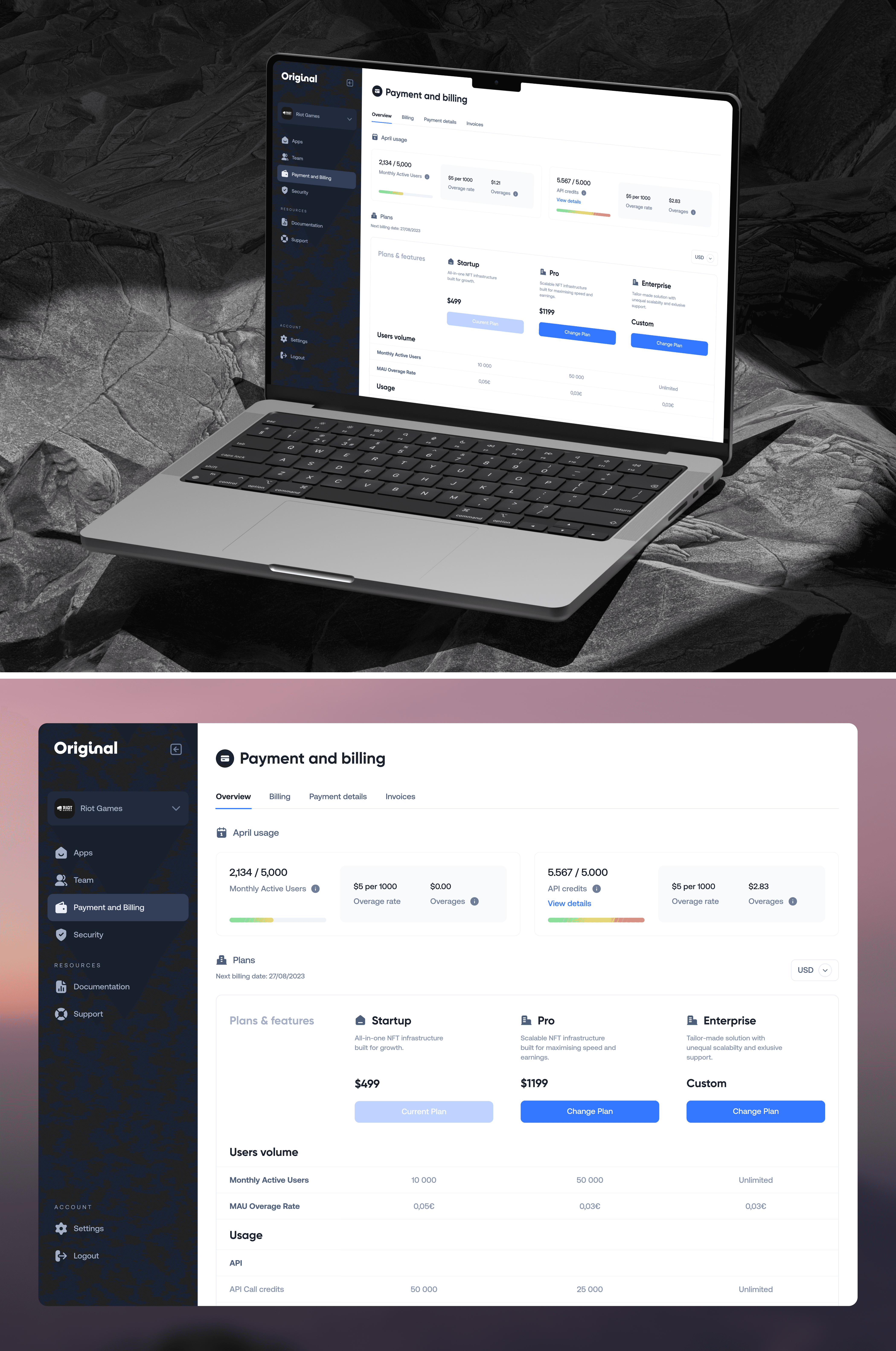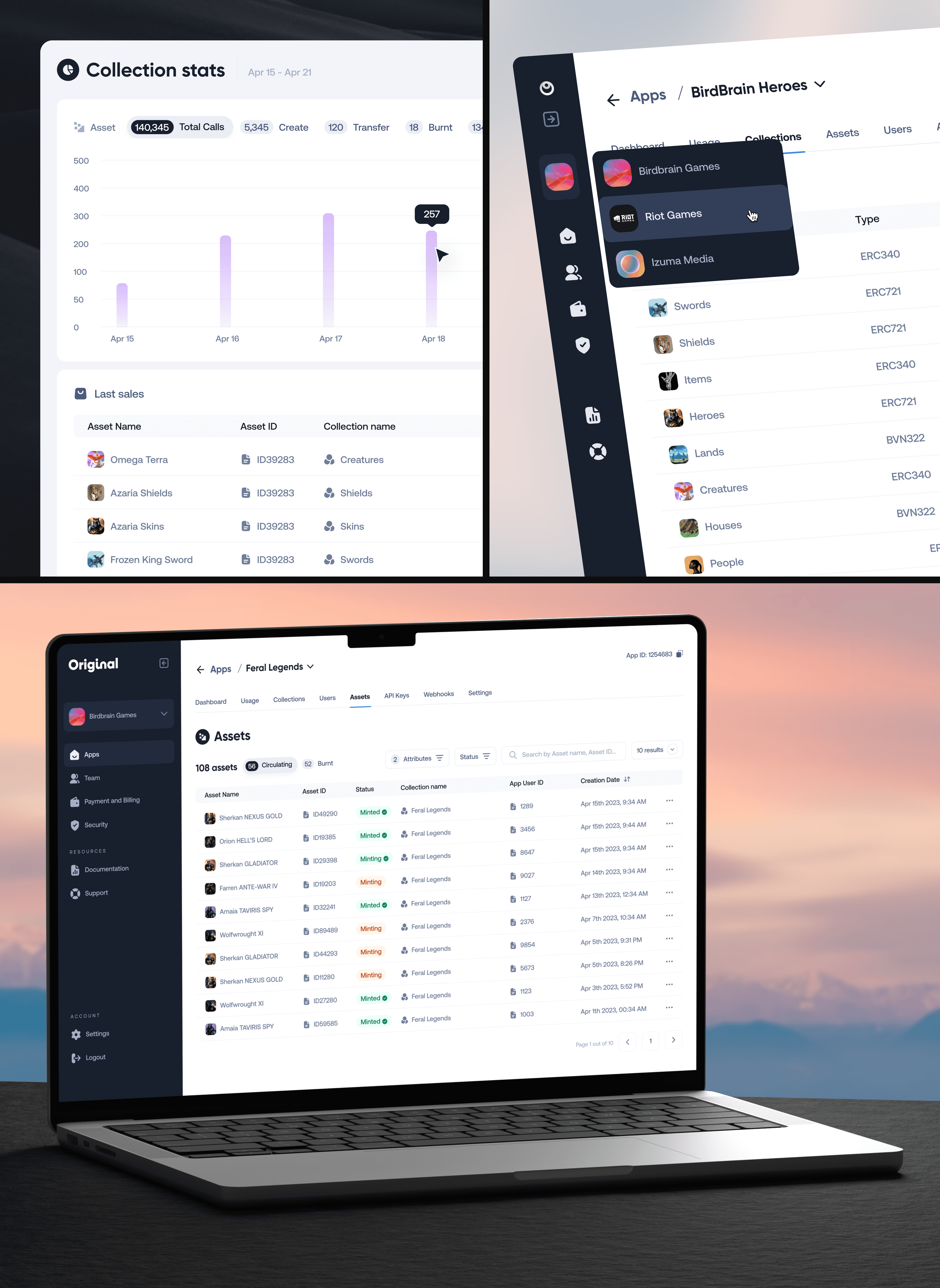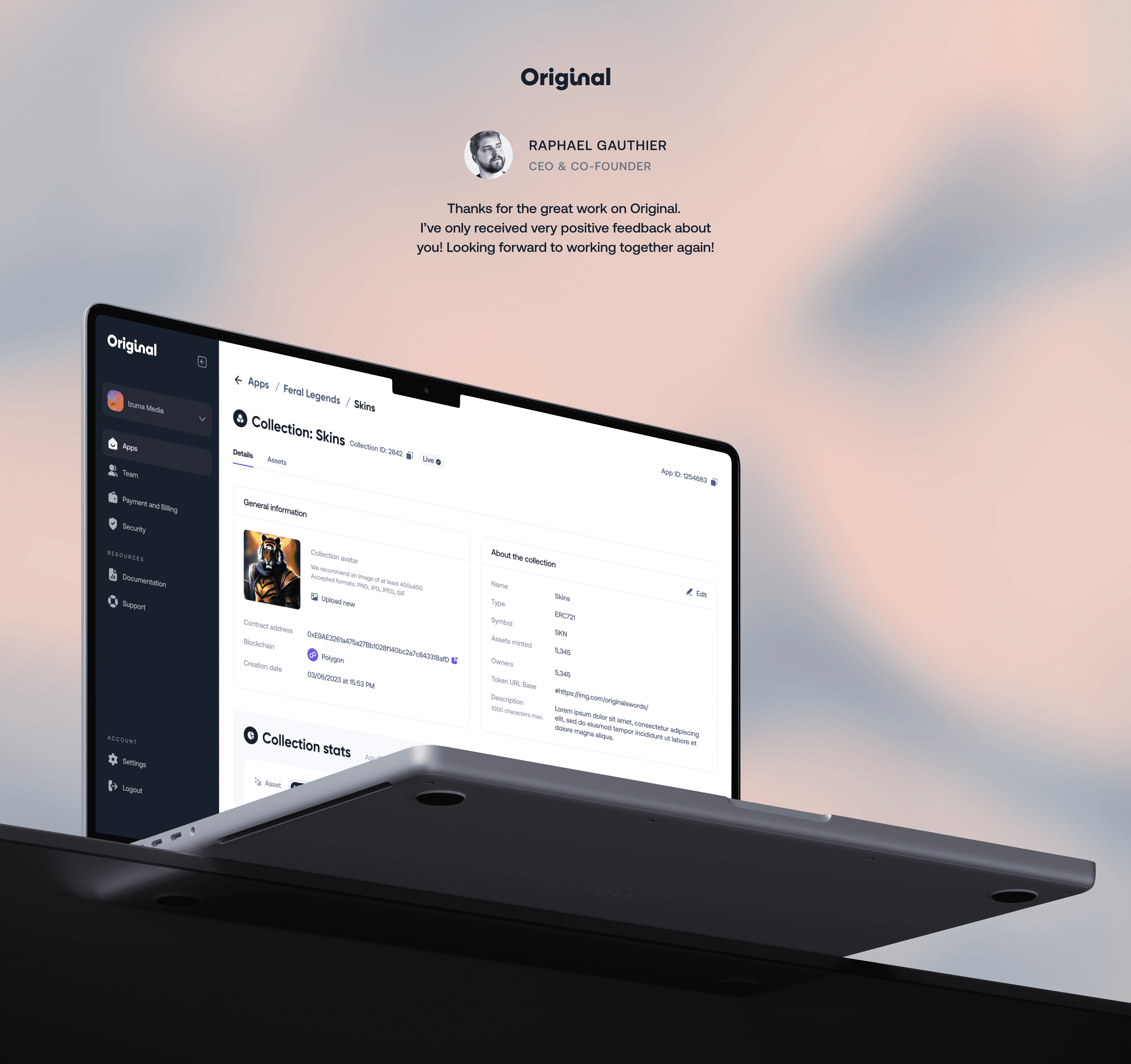 Original is a platform that works as an NFT back-end for mobile apps. It empowers them with a complete NFT infrastructure, to create, sell and transfer NFTs without managing wallets, smart contracts nor crypto. Build easily, onboard seamlessly!