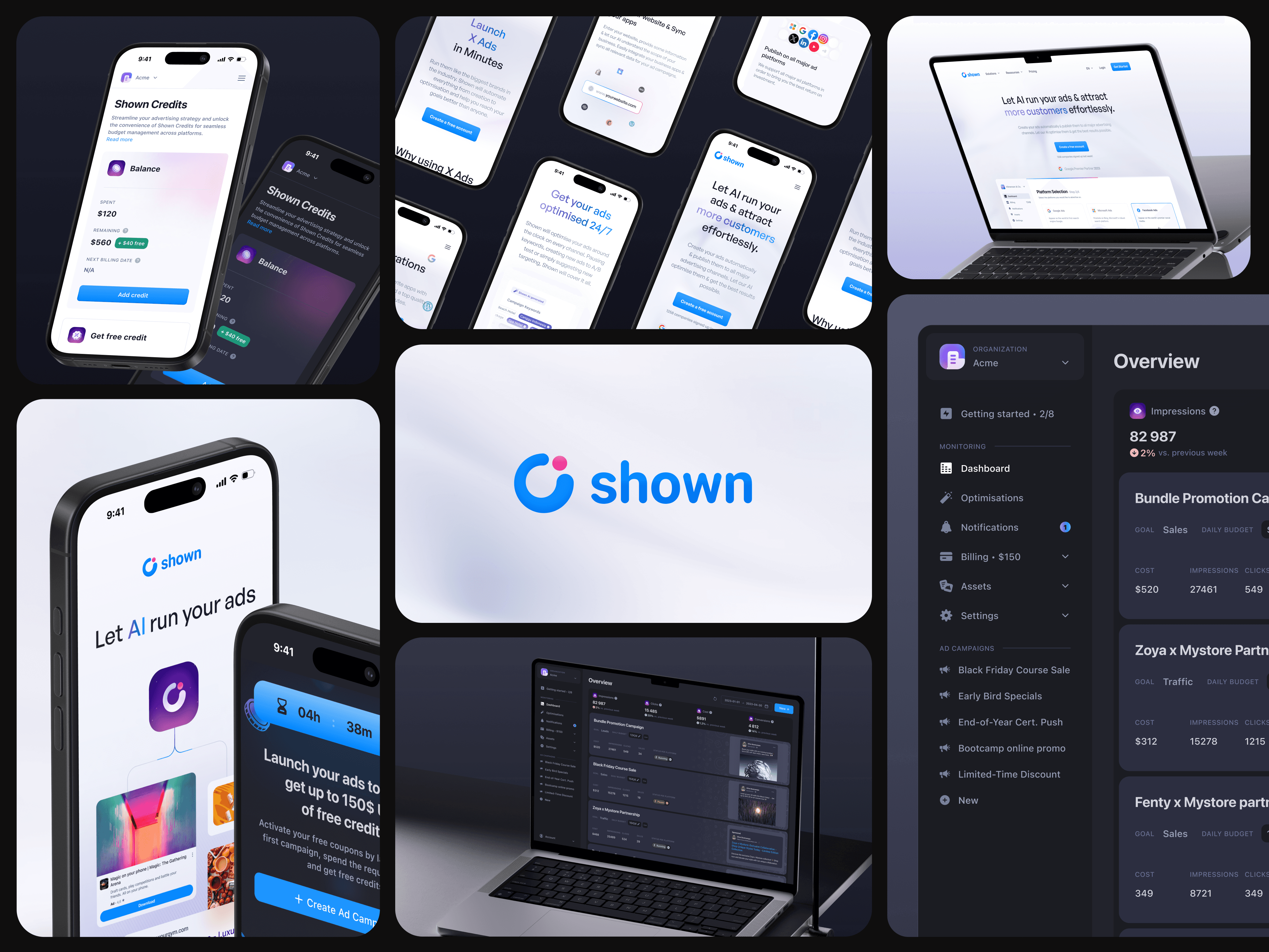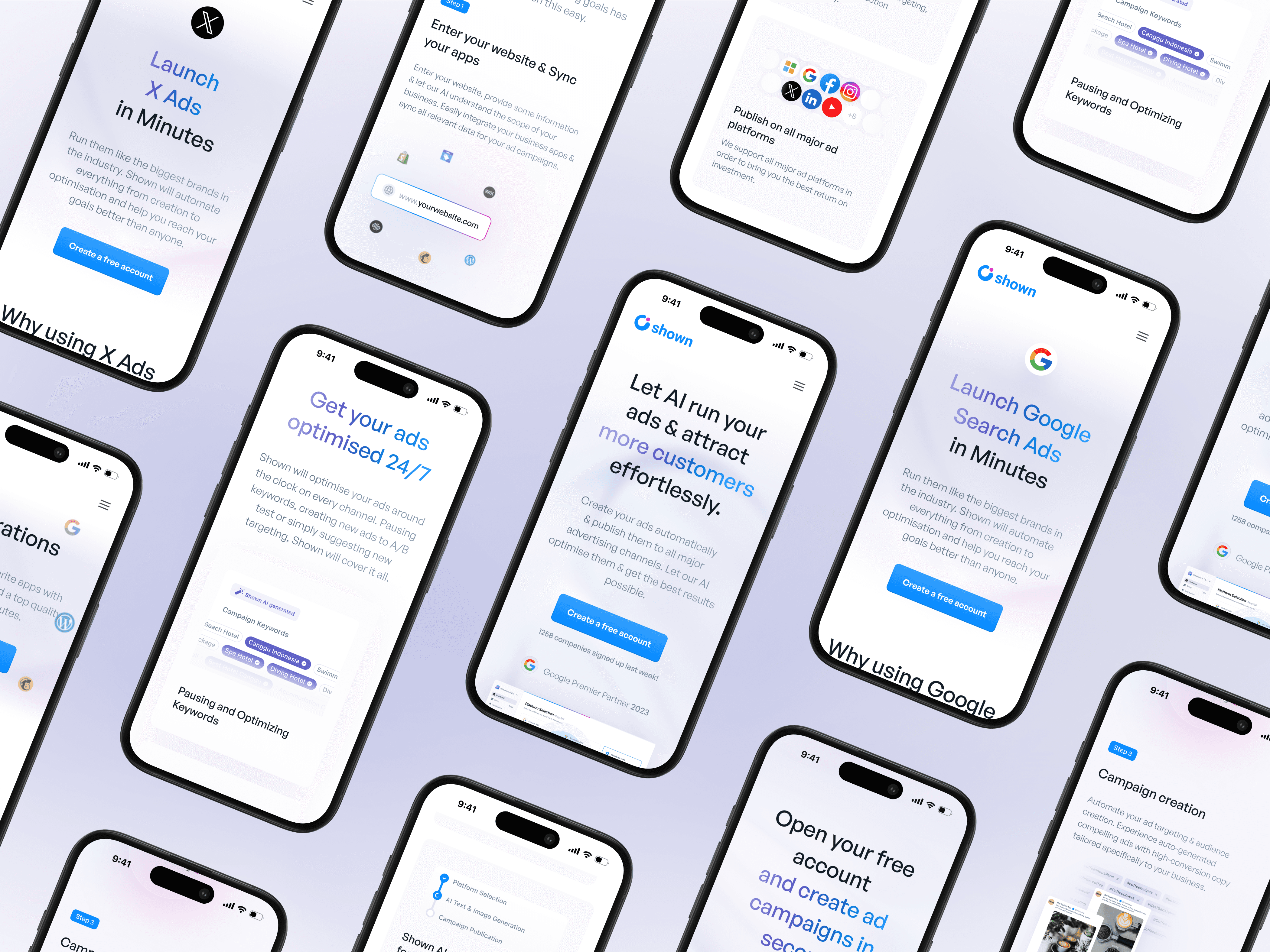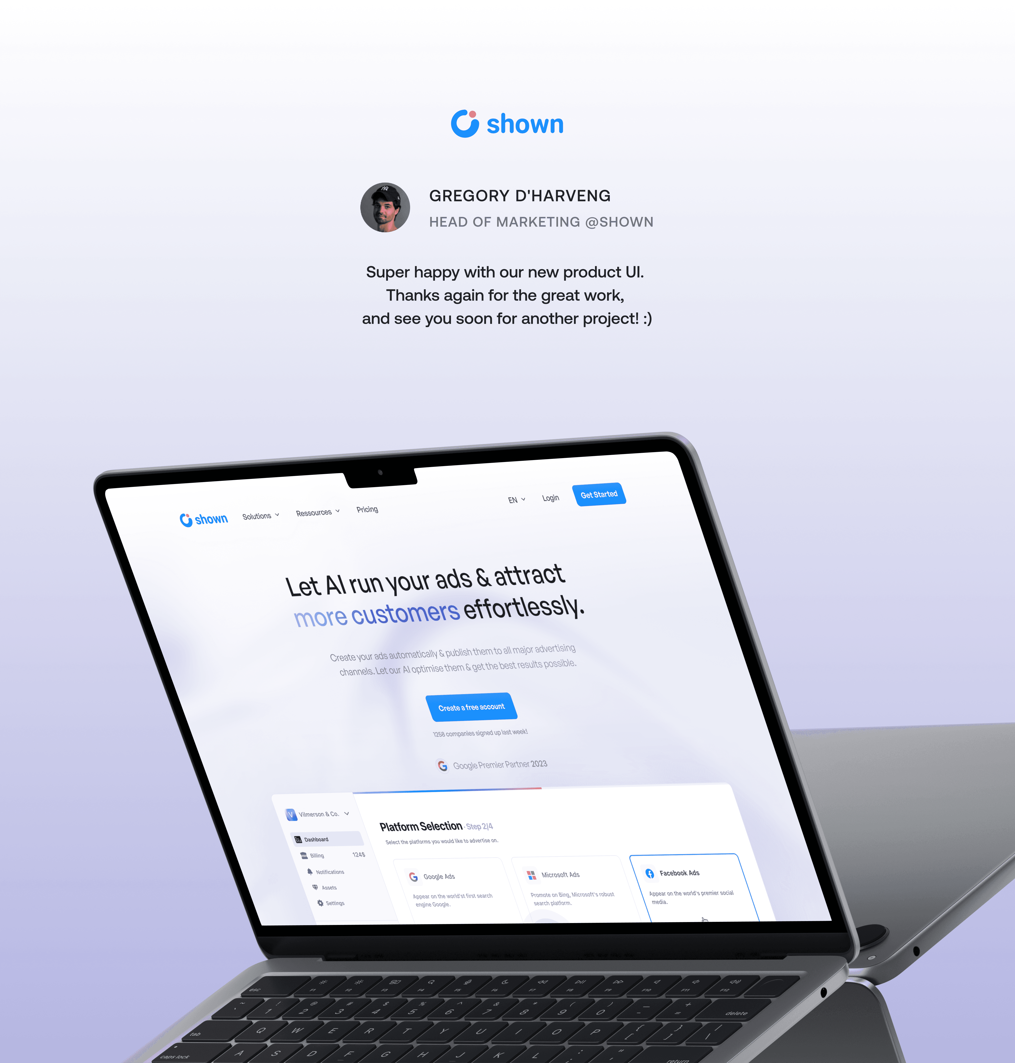 PRODUCT DESIGN After redesigning Shown's visual identity, we gradually refreshed anc cleaned the platform's visual style throughout our collaboration, aligning it with the new branding. One of the key challenges for Shown was to enhance the AI-powered ad creation and customization workflows, ensuring that even beginners in digital marketing could easily launch their ad campaigns. By analyzing the user's brand identity and business, Shown's AI recommends the best advertising platforms (Google, Instagram, X, LinkedIn...), along with tailored content and visuals, based on their specific needs.