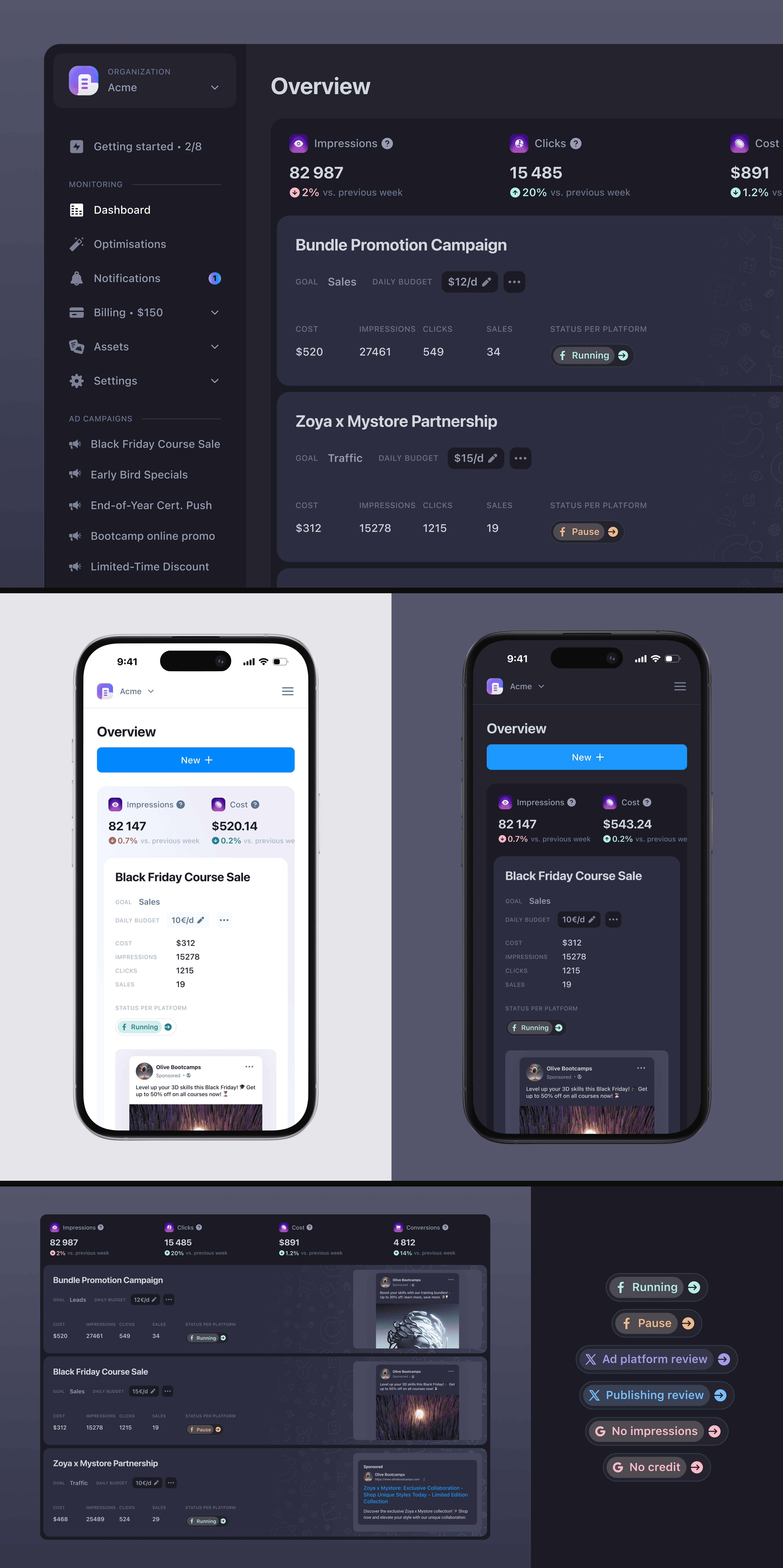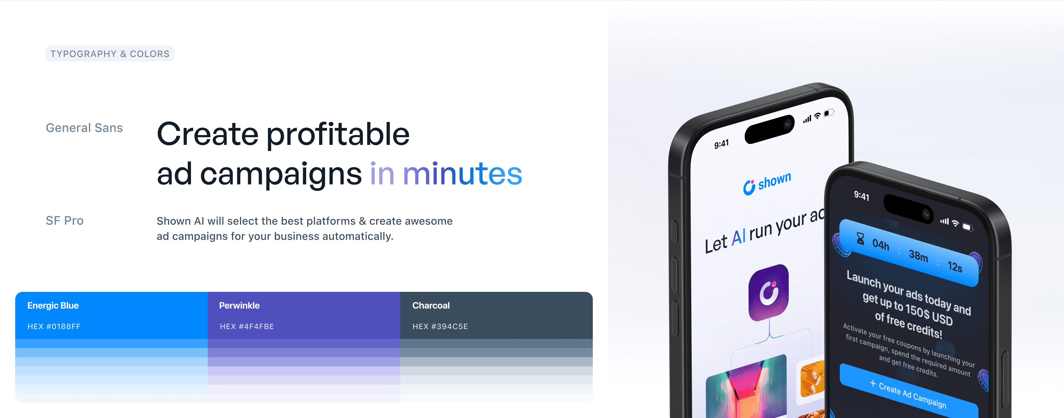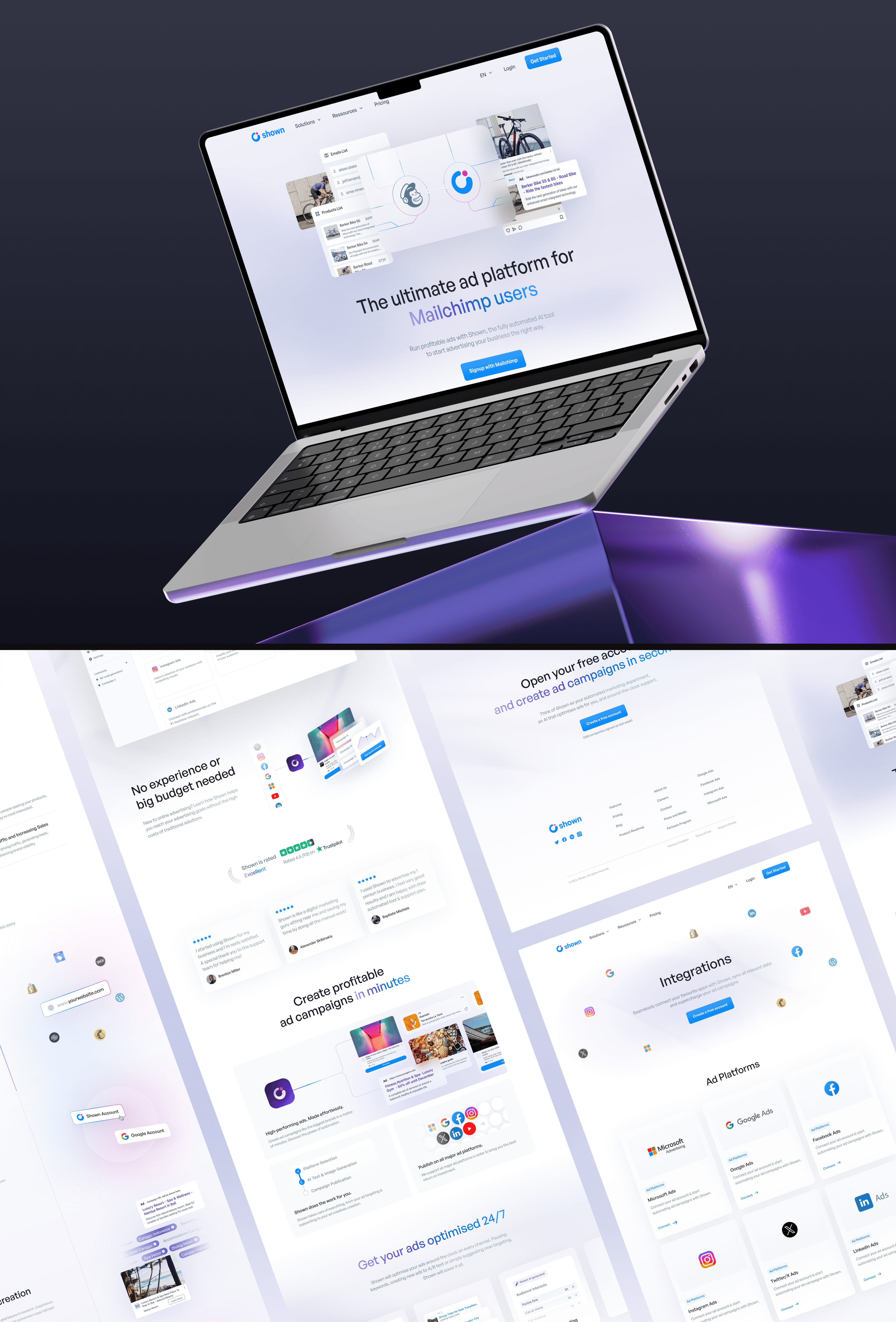 PRODUCT DESIGN After redesigning Shown's visual identity, we gradually refreshed anc cleaned the platform's visual style throughout our collaboration, aligning it with the new branding. One of the key challenges for Shown was to enhance the AI-powered ad creation and customization workflows, ensuring that even beginners in digital marketing could easily launch their ad campaigns. By analyzing the user's brand identity and business, Shown's AI recommends the best advertising platforms (Google, Instagram, X, LinkedIn...), along with tailored content and visuals, based on their specific needs.