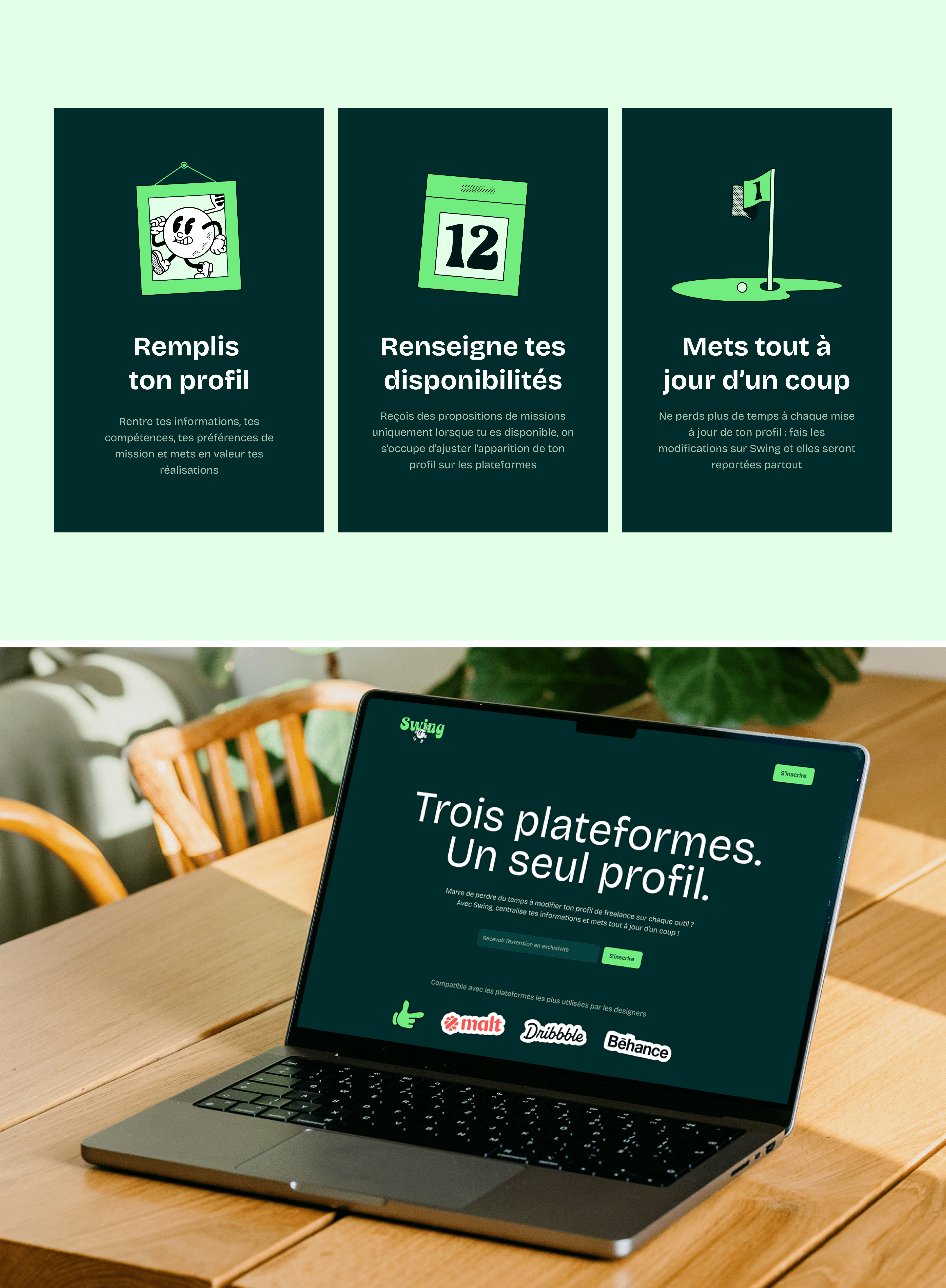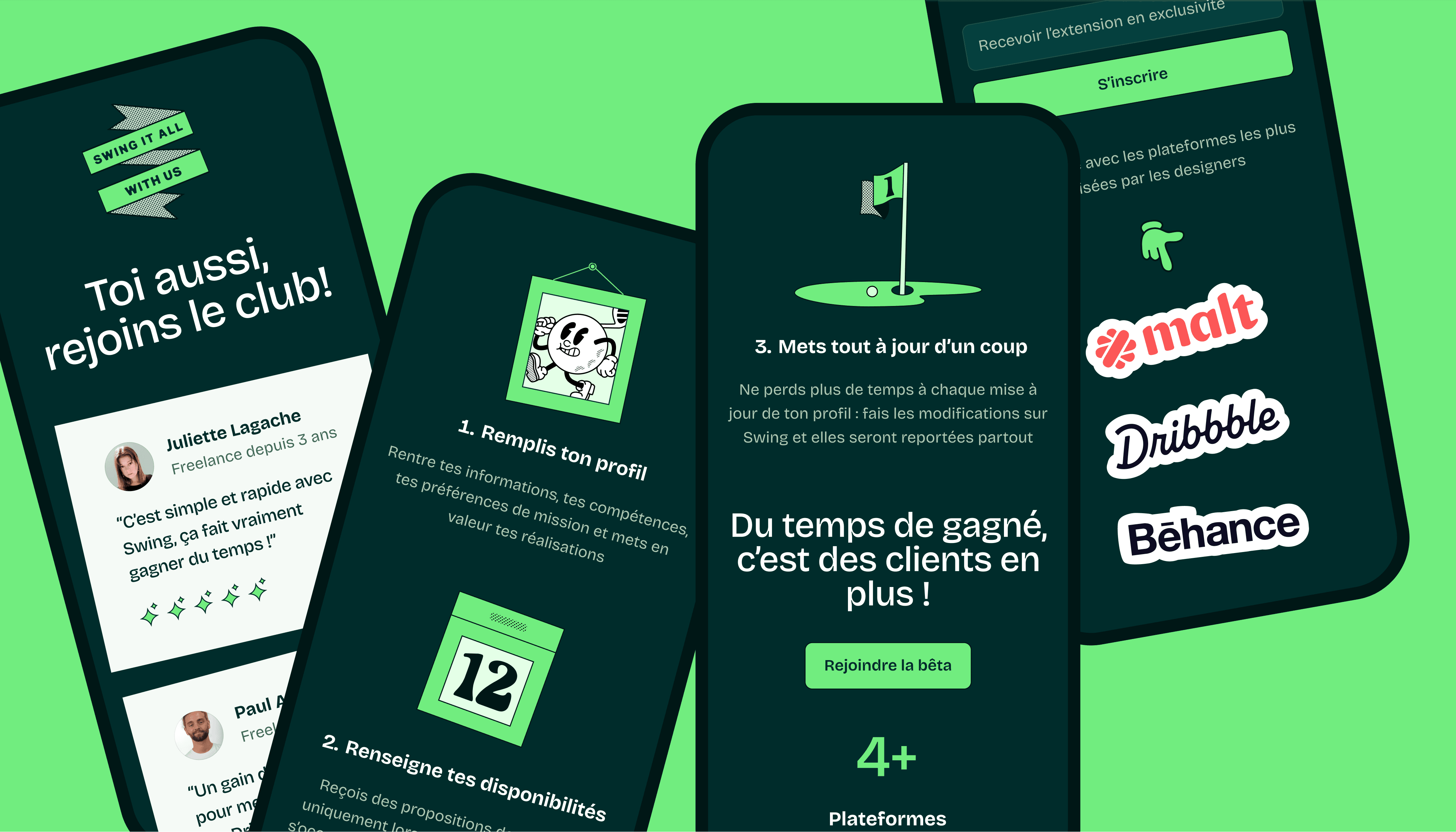 Swing is a free app and plugin that allows freelancers to publish and update their portfolio visuals and profile information on multiple platforms with just one click, all at once. The platforms available for this launch are Behance, Dribbble, and Malt. We created and developed this app during a 2-day hackathon within the Kapti collective.