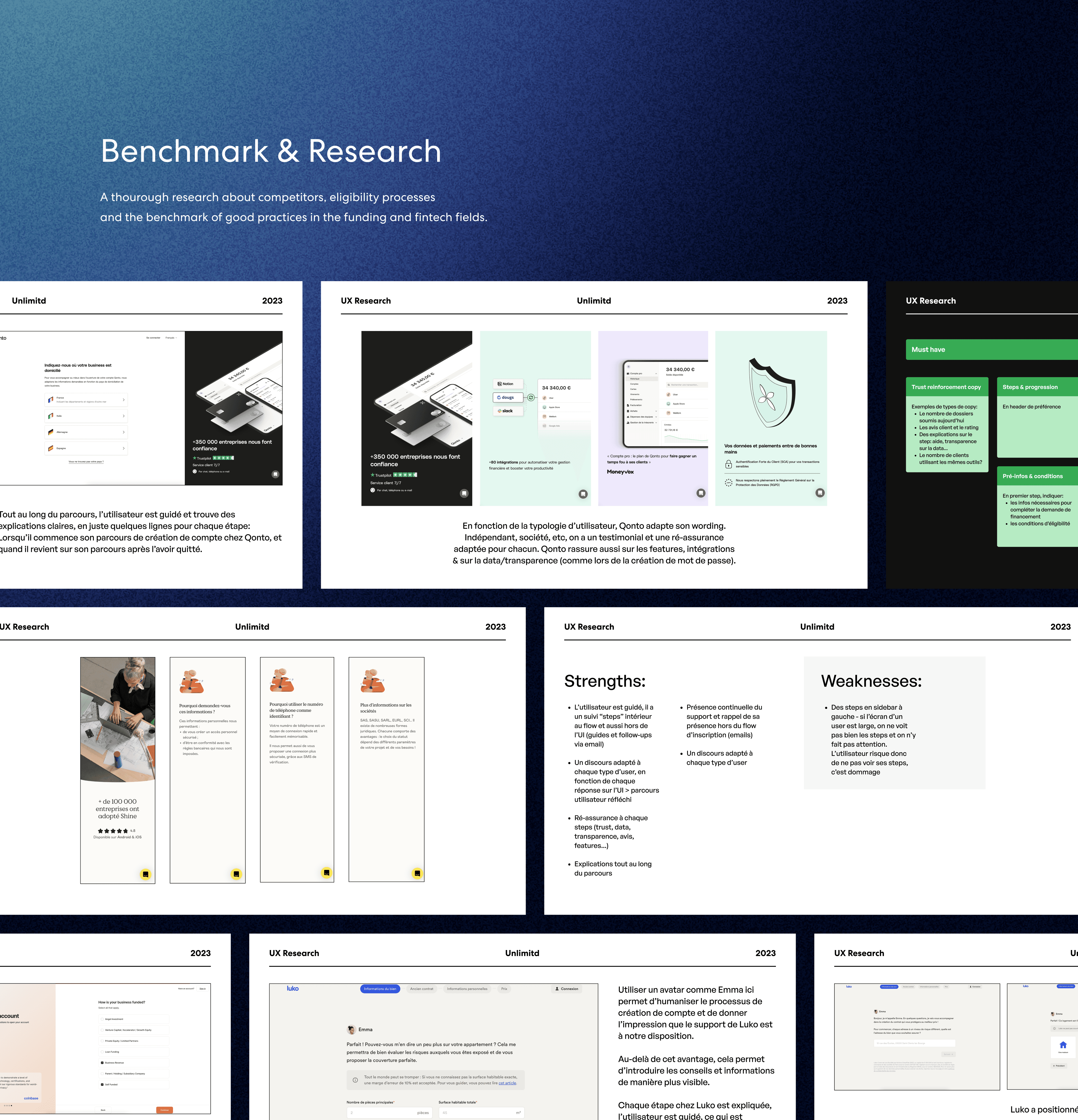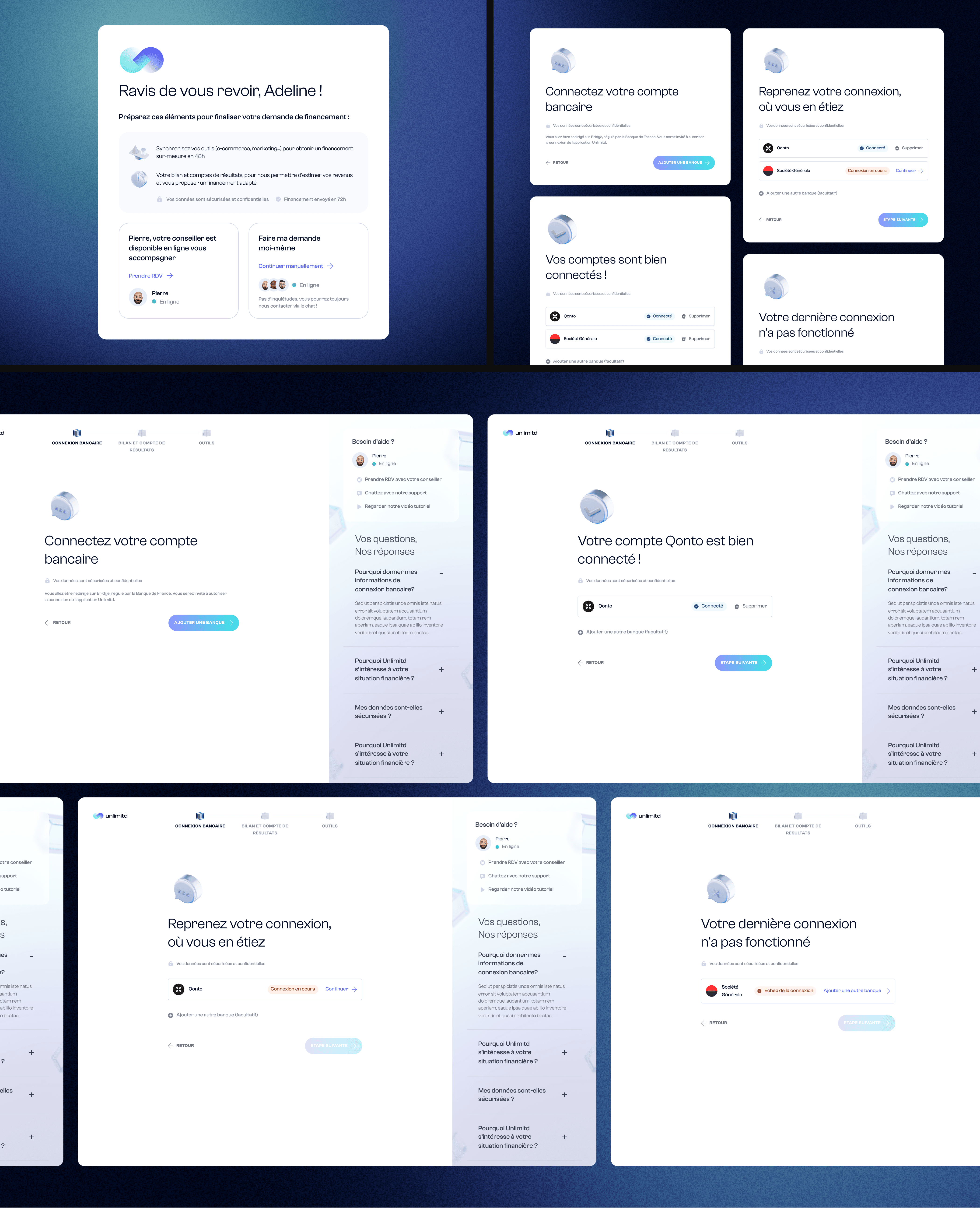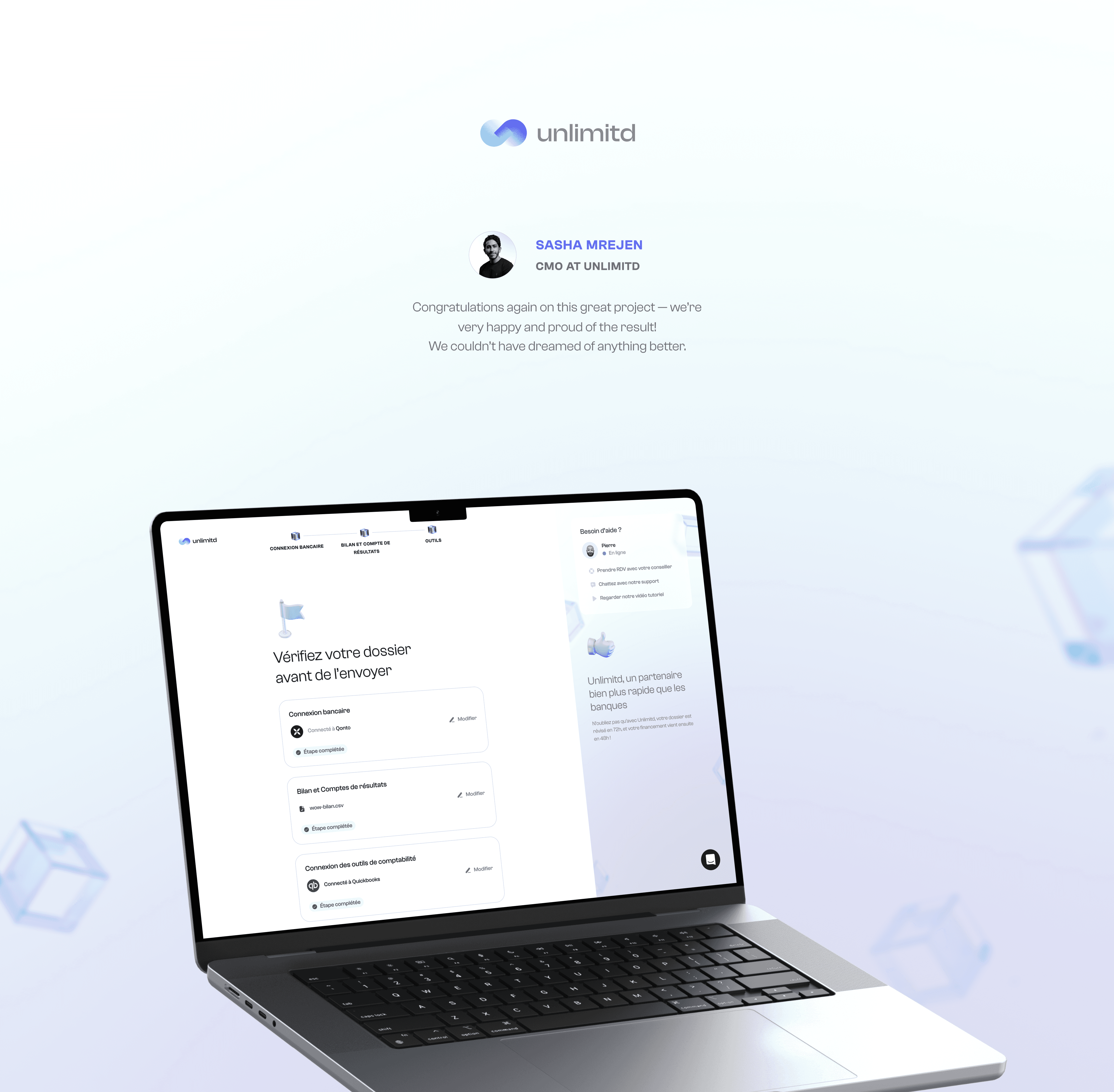 The first task was to review and redesign Unlimitd’s whole onboarding flow (UI/UX), in order to improve the user experience and to make fundings requests easy and quick. This part of Unlimitd’s service is key, as it is the moment that users first interact with Unlimitd’s services and are on the way to become clients. The second task was to complete and polish the new onboarding UI, as Unlimitd operated a rebranding with Pelo Studio, a French Design Agency. My role here was to help Unlimitd translate this new branding into their onboarding and product UI. This also meant completing the components library and adding a set of product color shades to the new brand color palette. Our collaboration was delivered with a fixed scope. It lasted 15 working days, spread over one month. This allowed us to take the time to review the designs, iterate, and validate the different user flows we created.