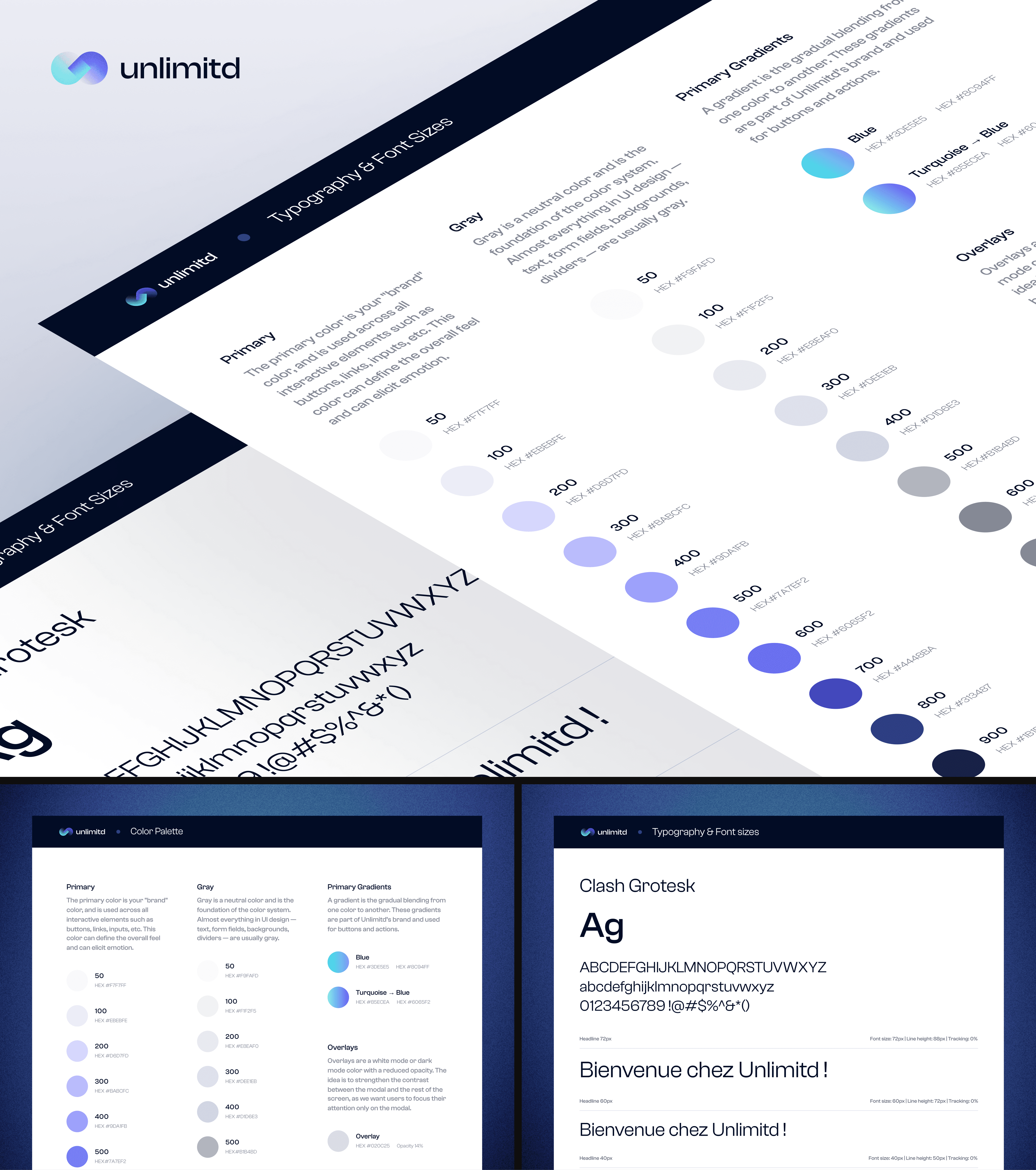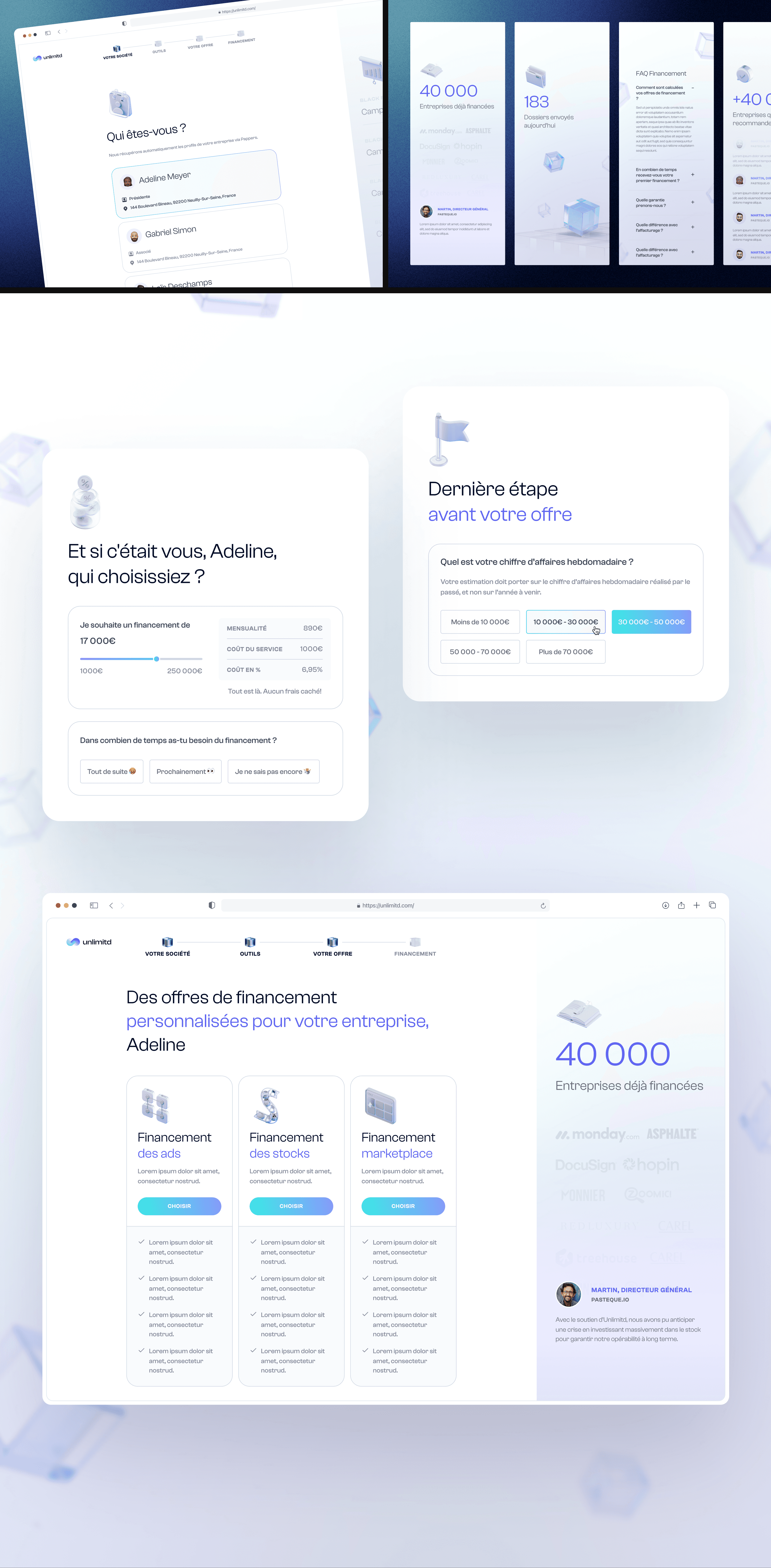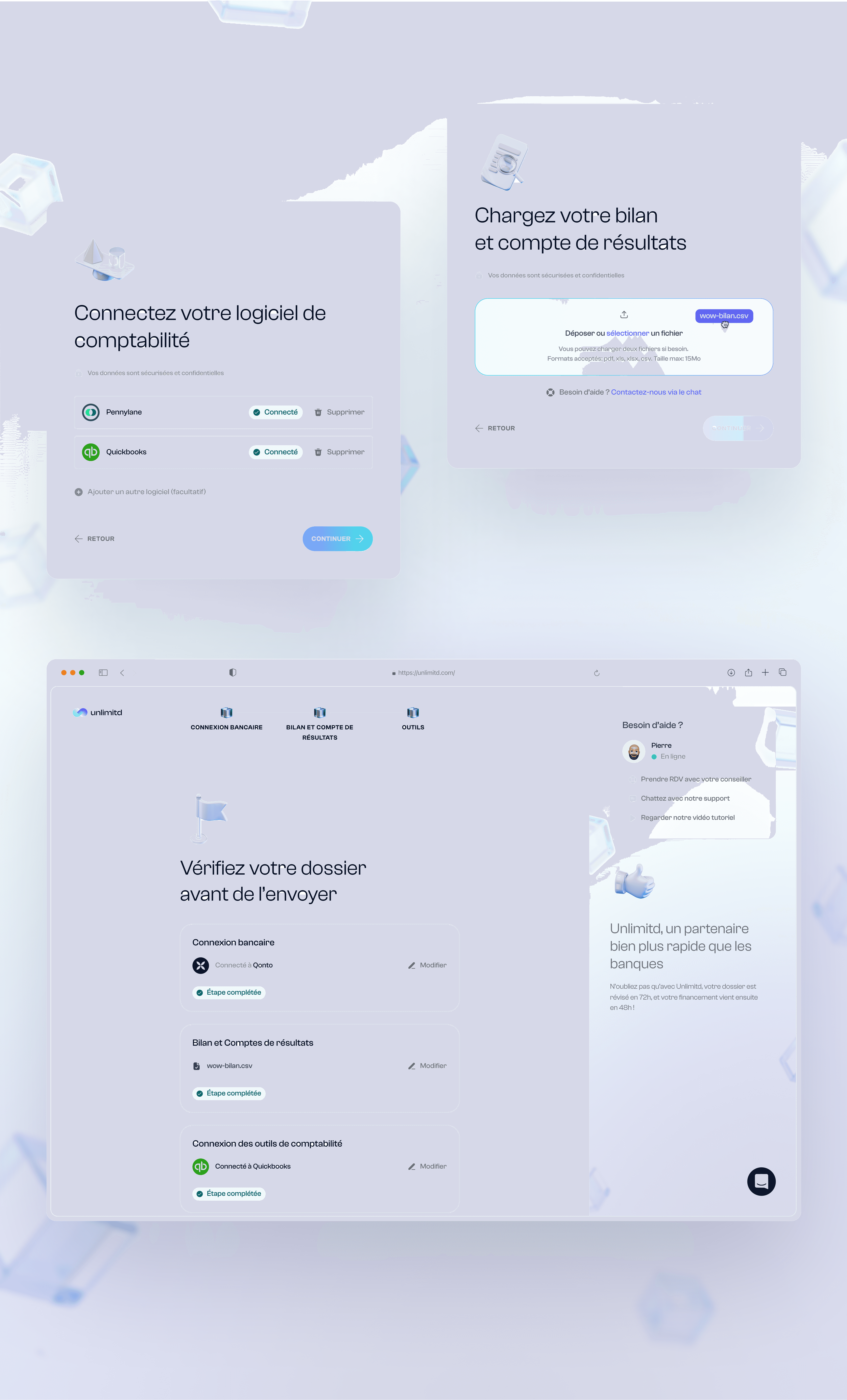 The first task was to review and redesign Unlimitd’s whole onboarding flow (UI/UX), in order to improve the user experience and to make fundings requests easy and quick. This part of Unlimitd’s service is key, as it is the moment that users first interact with Unlimitd’s services and are on the way to become clients. The second task was to complete and polish the new onboarding UI, as Unlimitd operated a rebranding with Pelo Studio, a French Design Agency. My role here was to help Unlimitd translate this new branding into their onboarding and product UI. This also meant completing the components library and adding a set of product color shades to the new brand color palette. Our collaboration was delivered with a fixed scope. It lasted 15 working days, spread over one month. This allowed us to take the time to review the designs, iterate, and validate the different user flows we created.